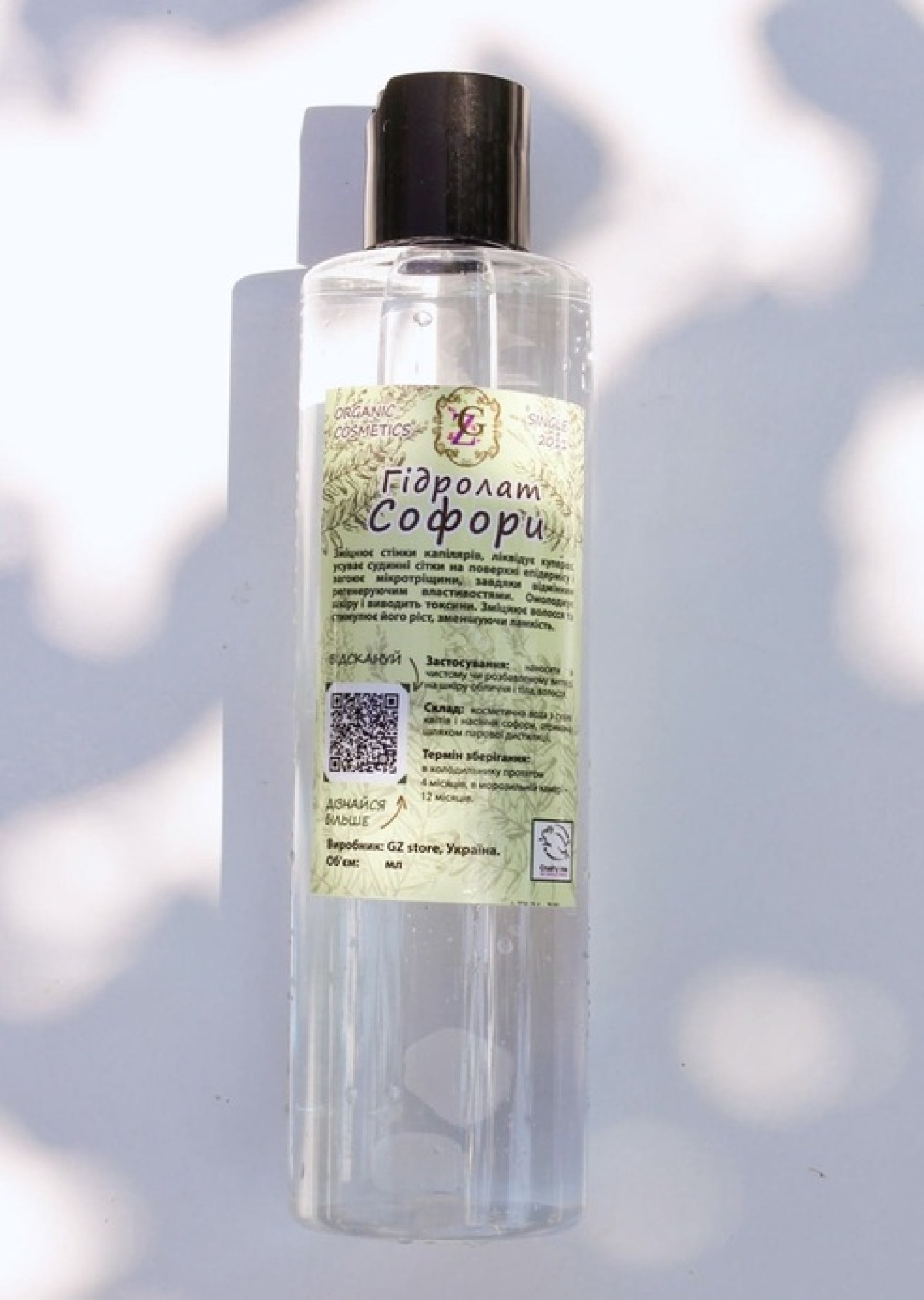 Косметична вода з сухих квітів і насіння софори, отримана шляхом парової дистиляції.
