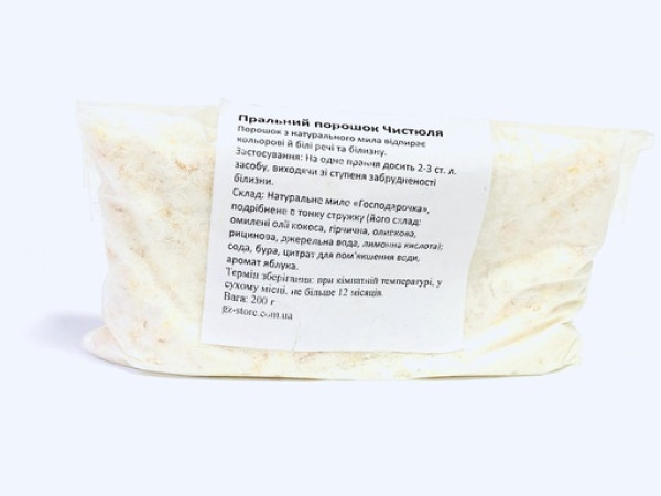 Натуральне мило «Господарочка», подрібнене в тонку стружку (його склад: омилені олії кокосу, гірчична, оливкова, рицинова, джерельна вода, лимонна кислота);  сода, бура, цитрат для пом'якшення води, аромат яблука.