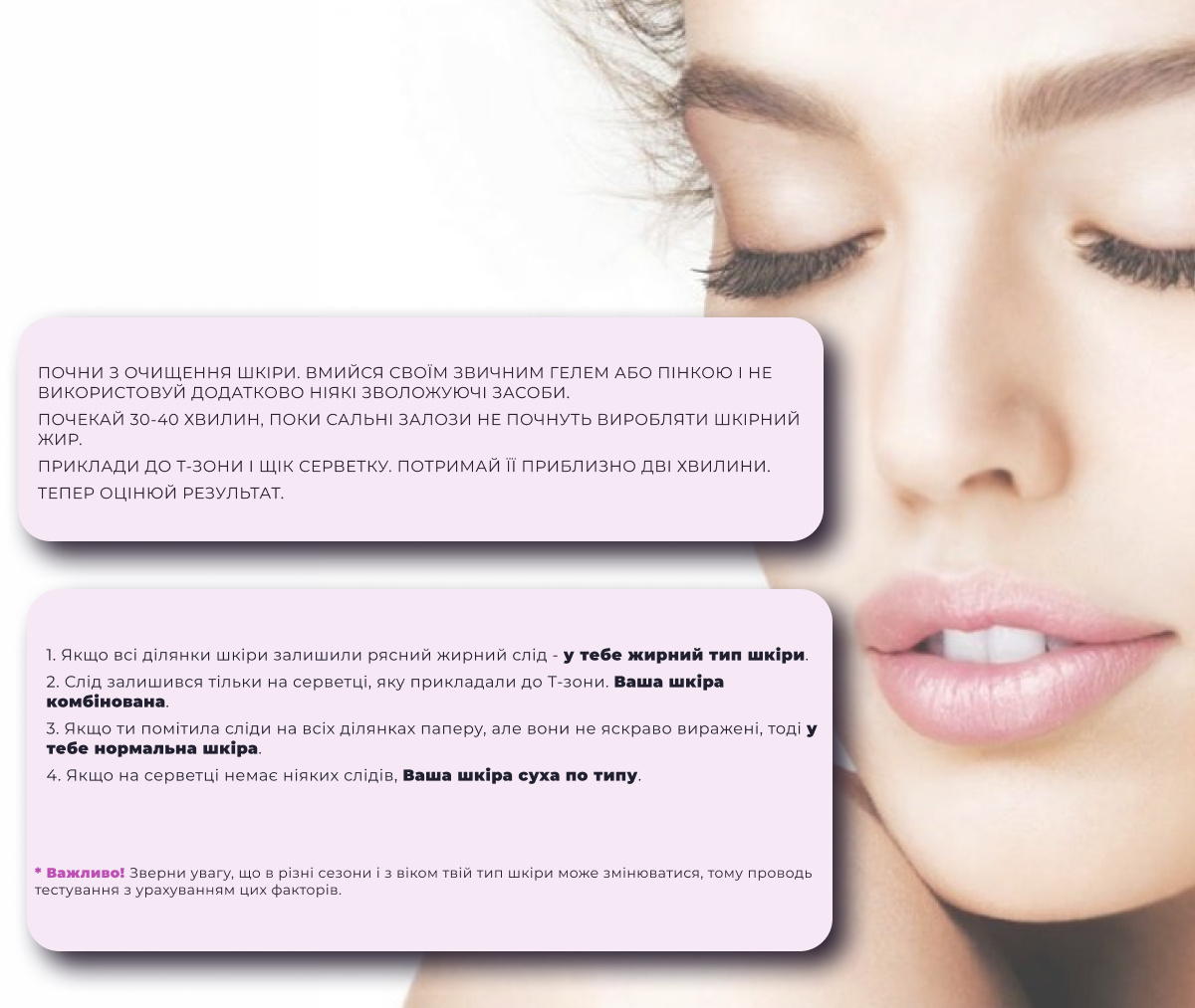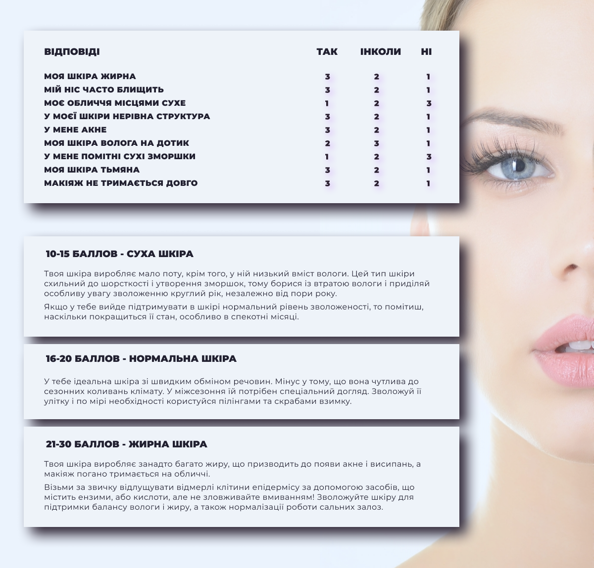 Обирай відповіді, які найкраще характеризують твою шкіру і порахуй бали, щоб визначитися з типом.