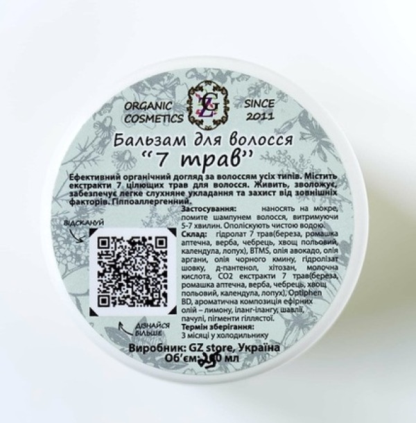 Органический бальзам для волос «7 трав» увлажняет, питает локоны и кожу головы. Облегчает расчесывание и укладку, надежно защищает от влияния внешних факторов и температур. Гипоаллергенен.