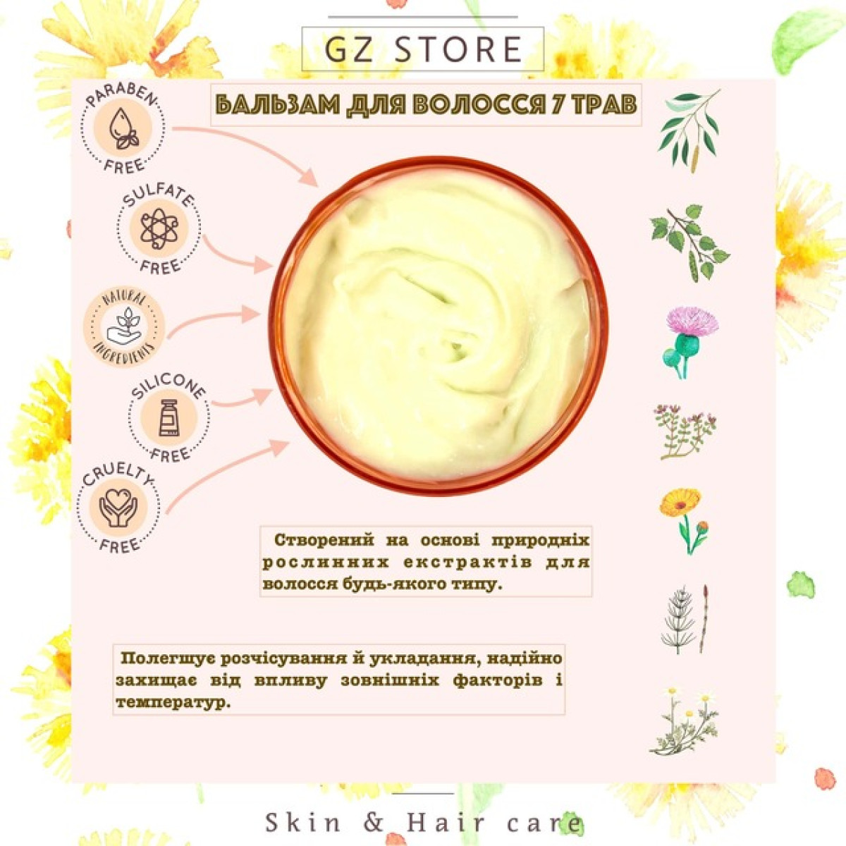 Органический бальзам для волос «7 трав» увлажняет, питает локоны и кожу головы. Облегчает расчесывание и укладку, надежно защищает от влияния внешних факторов и температур. Гипоаллергенен.