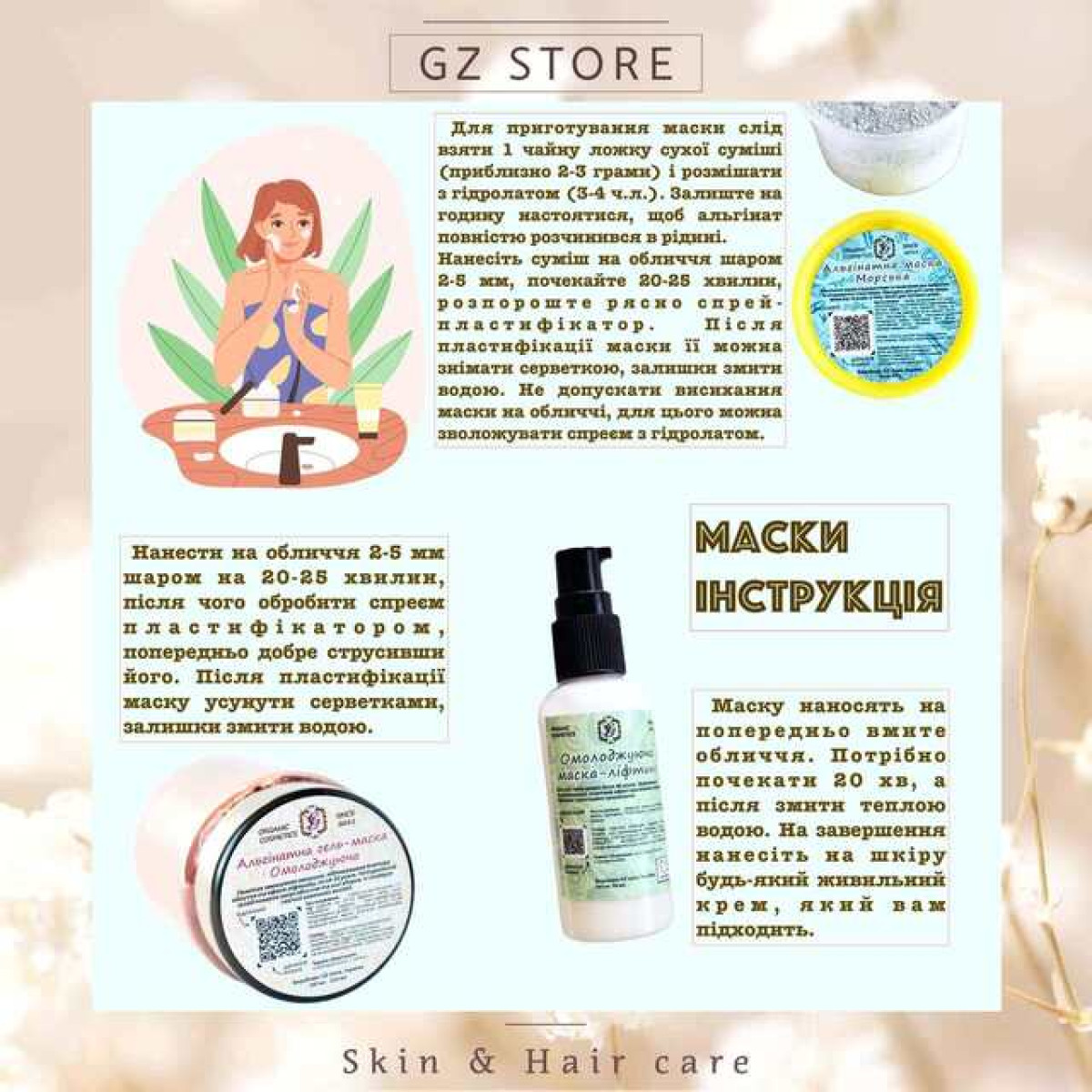Применение: Нанести на лицо 2- 5 мм слоем на 20-25 минут, после чего обработать спреем пластификатором, предварительно хорошо встряхнув его. После пластификации маску удалить салфетками, остатки смыть водой.
