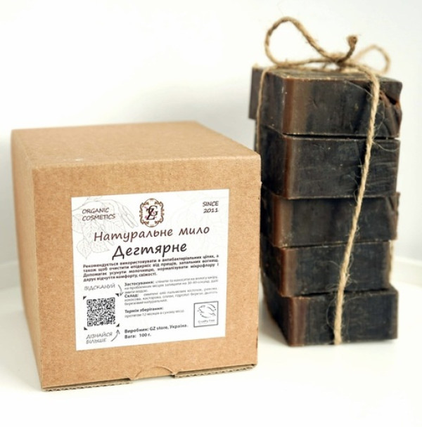 Натуральное дегтярное мыло создано из органического сырья. Масла, гидролаты и деготь содержат витамины, микроэлементы и полезные вещества, увлажняют кожу, регенерируют ее и устраняют патогенные микроорганизмы, бактерии. Продукт результативно обеззараживает эпидермис, поэтому может использоваться как вспомогательное средство при лечении грибков.