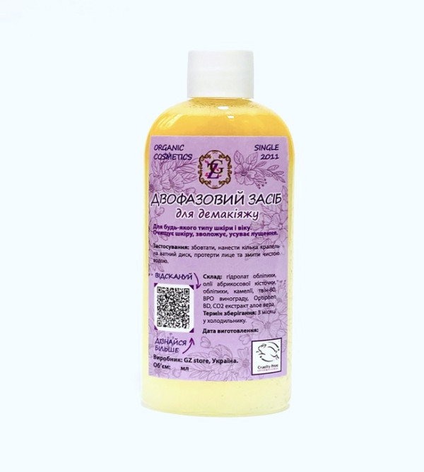 Двофазний засіб м'яко і дбайливо очистить пори, зніме залишки косметики, шкірного жиру і вуличного бруду. У його складі числяться натуральні компоненти, які не викликають подразнення шкіри і слизових.