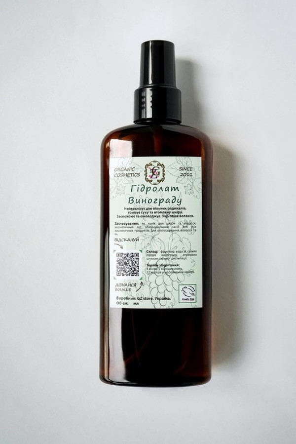 Гідролат винограду - це натуральний органічний засіб, який ефективно впливає на суху і стомлену шкіру, знімає роздратування і почервоніння, а також результативно зволожує клітини епідермісу, тонізує їх і покращує загальний вигляд у цілому. Фруктова виноградна вода визнана одним з кращих антиоксидантних продуктів і дієвим захистом для клітин від патогенного впливу вільних радикалів. У разі застосування гідрозоля винограду для волосся, ви зміцните його від цибулин до кінчиків, забезпечите здоров'я і приголомшливий блиск.