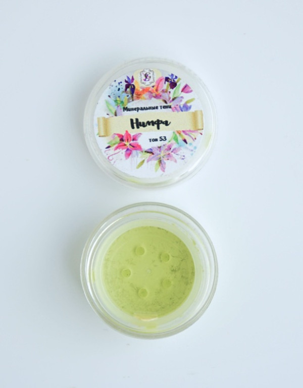 Мінеральні тіні теплого матового салатового кольору «Німфа». До складу косметики входять тільки натуральні мінеральні пігменти, які не викликають подразнення і алергічних реакцій.