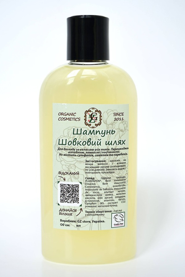 Натуральний шампунь Шовковий шлях створений для догляду за волоссям усіх типів, і в тому числі підходить для сухого пошкодженого волосся. Формула засобу повністю органічна, не містить сульфатів та синтетичних складових, тому є абсолютно гіпоаллергенною, безпечною і не токсичною.