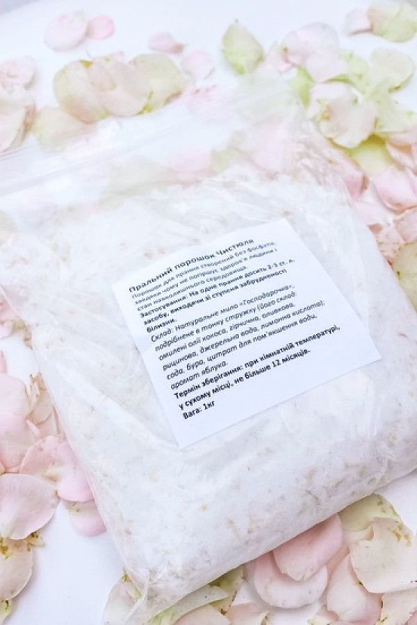 Натуральне мило «Господарочка», подрібнене в тонку стружку (його склад: омилені олії кокосу, гірчична, оливкова, рицинова, джерельна вода, лимонна кислота);  сода, бура, цитрат для пом'якшення води, аромат яблука.