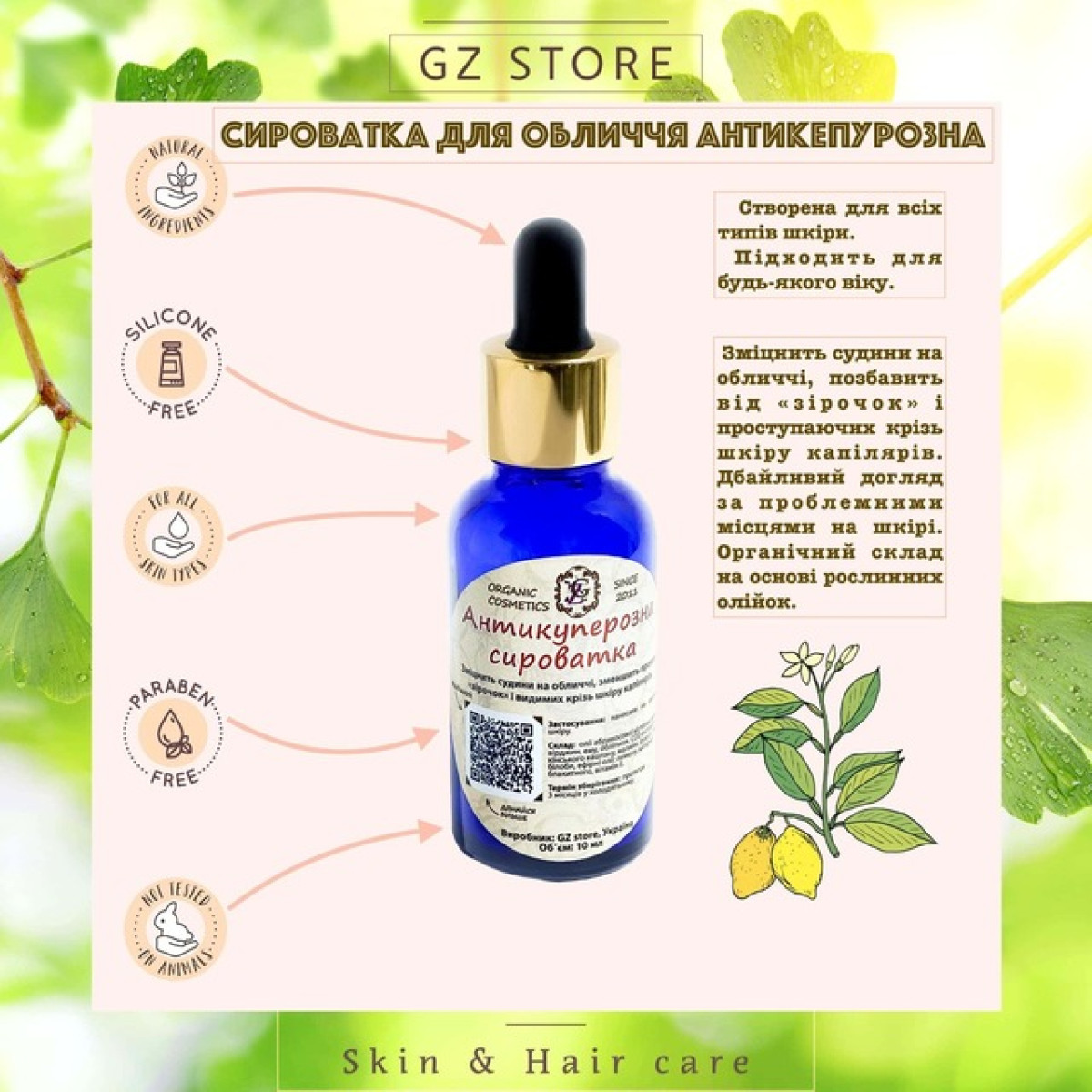 Антикуперозна сироватка зміцнить судини на обличчі, позбавить від «зірочок» і проступаючих крізь шкіру капілярів. Дбайливий догляд за проблемними місцями на шкірі. Органічний склад на основі рослинних олійок. Вік застосування - без обмежень.