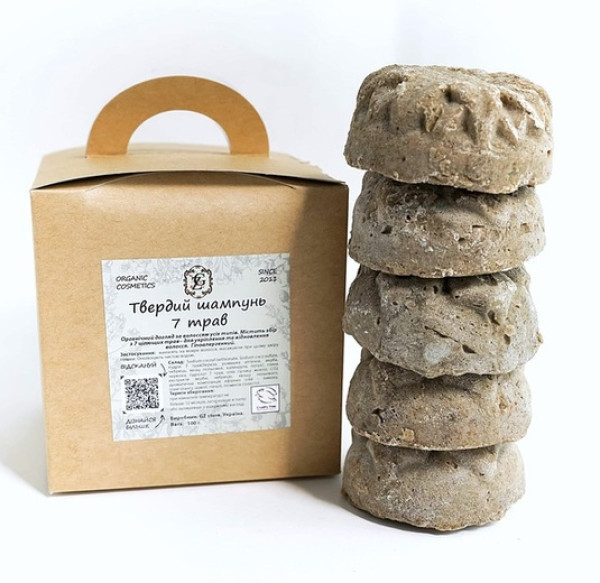 Твердий шампунь «7 трав» створений для комплексного органічного догляду за волоссям всіх типів. Повноцінно очищає, перешкоджає випаданню і робить локони сяючими, еластичними.  Гіпоалергенний.